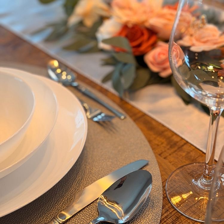 - Premium keramische borden, linnen servetten en zilverkleurig bestek.