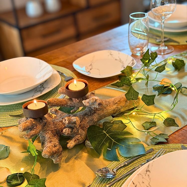 - Een natuurlijk middenstuk met groene accenten, houten details of organische texturen.