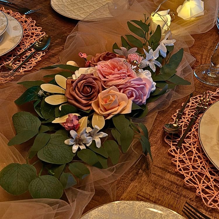 - Romantisch bloem-centerpiece in zijde- of gedroogde pasteltinten.